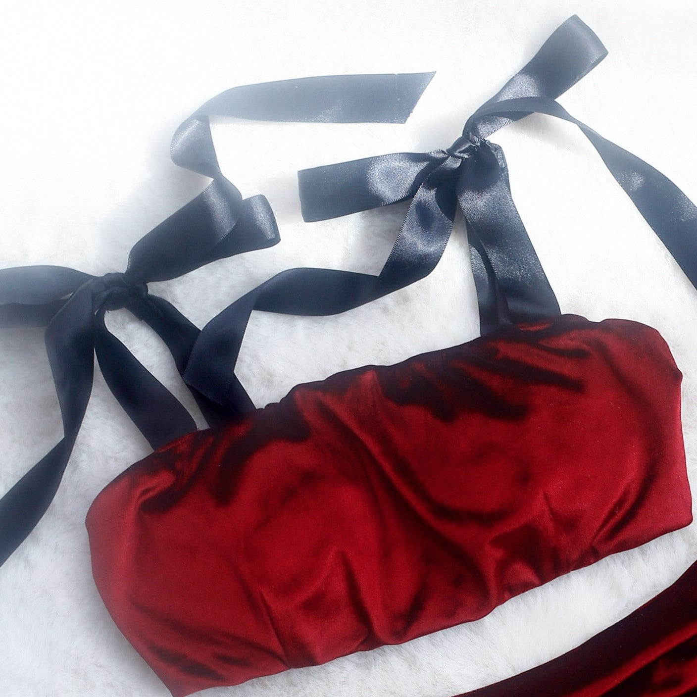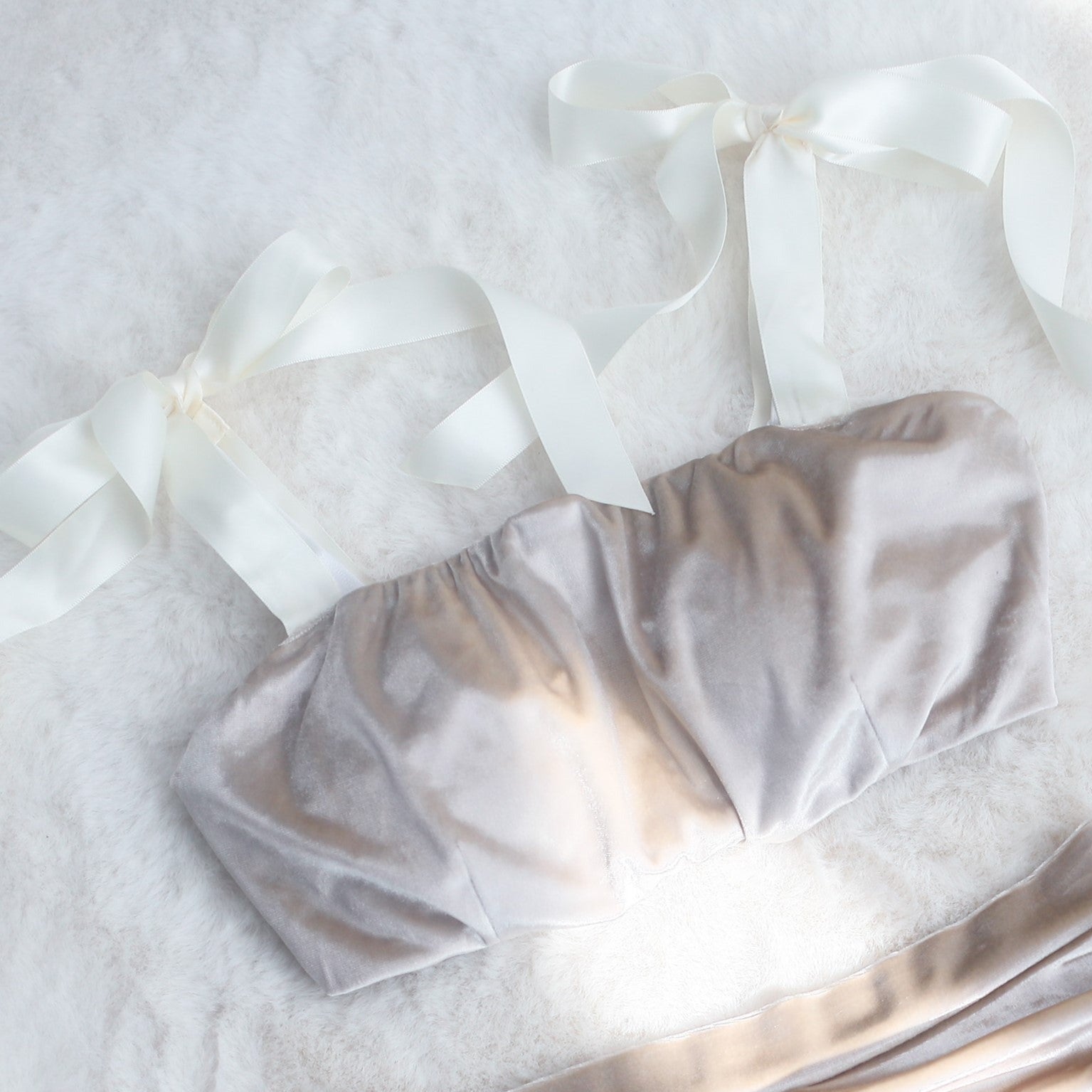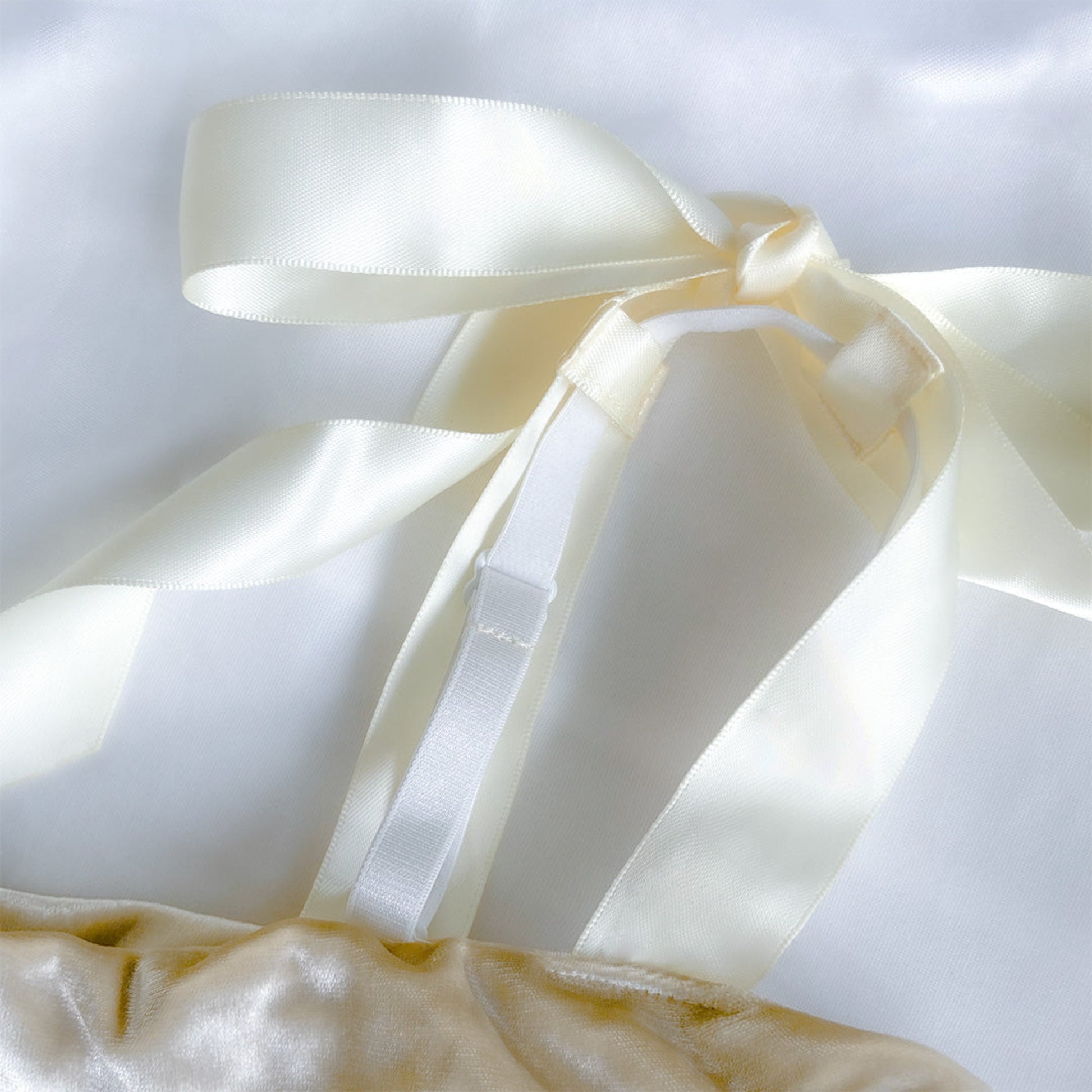 Adjustable shoulder straps. Ribbons secured to the straps with hidden loops so they will not fall